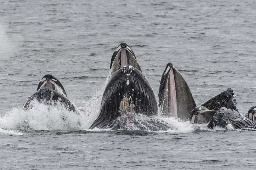 Soon it was time to head east into Icy Strait and continue onward toward the next morning’s activities farther south. So, up came the anchor again, and we started motoring east, and then southward toward Thomas Bay, and then the lovely town of Petersburg. But luckily, some large meg-fauna, in the form of humpback whales, were spotted feeding in the distance on the northern side of Icy Strait! It turned out to be about eight animals doing a unique feeding behavior called “Cooperative Bubble Netting”, which is distinctive to Southeast Alaska, and one of the most spectacular events you can be privileged to witness on our planet!