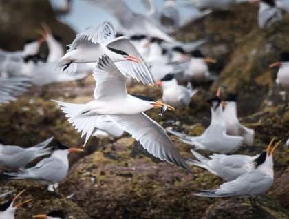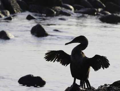 Many of us woke up early this morning to try to find some marine life from the sundeck while we circumnavigated the northern side of Isabela (the sea horse shaped Island).  The titans, known as Ecuador and Wolf volcanoes, looked spectacular with colorful lava fields decorated with a yellowish color, harmonizing with the sky on this beautiful morning.  After breakfast the ship crossed the equator line, so we celebrated with a special ceremony.  As soon we dropped anchor at Punta Vicente Roca we headed out on a Zodiac ride along the coast of Isabela to observe several geological features which are evidence of previous eruptions which occurred long ago.  We saw long lines of black lava and blue footed boobies and frigate birds who were looking for food.  The sun appeared and warmed up this location and marine iguanas did not lose time to start swimming and trying to eat some seaweed.  They were accompanied by some Galapagos penguins which swam as fast as torpedoes and fed on small black striped Salemas.  We also spotted flightless Cormorants feeding underwater.  We headed back to the National Geographic Islander so our guests could get ready for the snorkeling activity.  Our explorers found different species of fish, but probably the most interesting and abundant creatures of all were the green turtles. Of course, Galapagos penguins and flightless cormorants delighted our guests who enjoyed swimming with incredible creatures like nowhere else in the world.