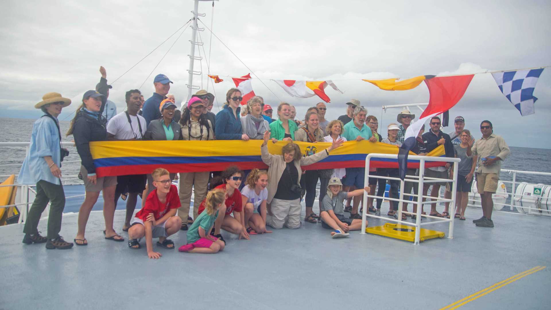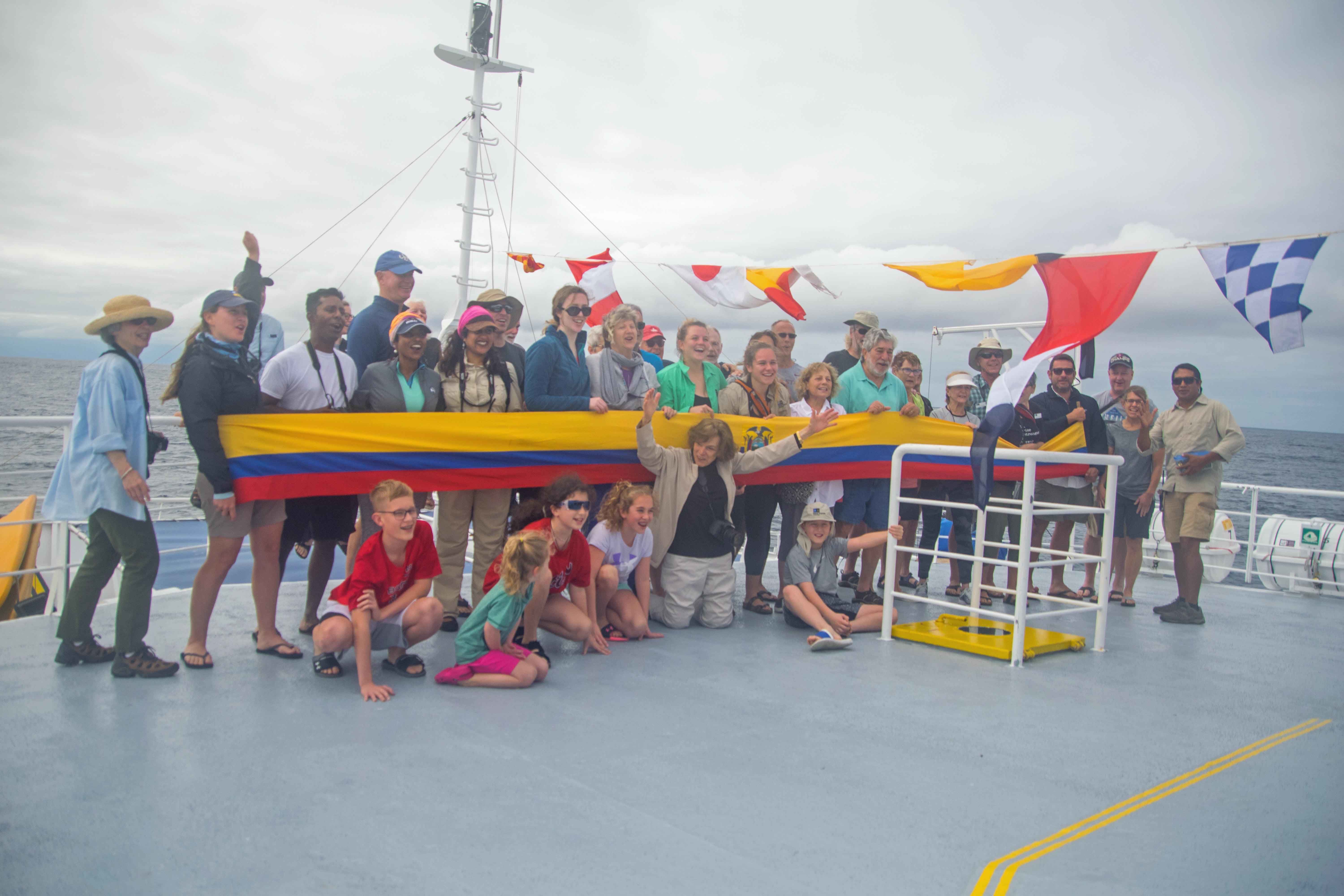 Today we had one of the most exciting days of our expedition. We traveled to the western part of the Archipelago. Early in the morning, after breakfast, we crossed the Equator and celebrated this with by walking north and south of the equatorial line. Later, we snorkeled around Punta Vicente Roca; the conditions were ideal, and the visibility was perfect to spot dozens of green sea turtles, flightless cormorants, Galapagos penguins, sea lions, and fur seals.