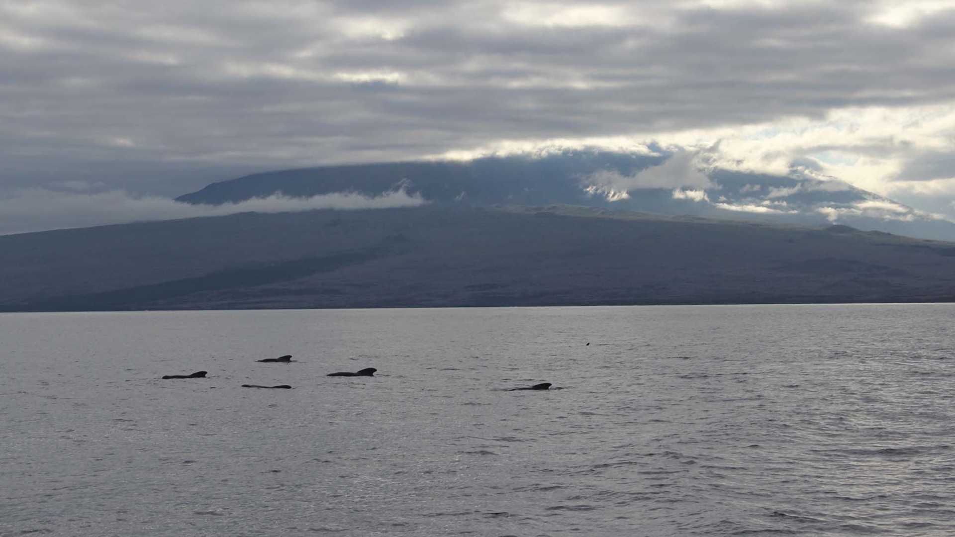 We cruised on smooth seas during the night and at daybreak were north of Isabela Island, having crossed the equator in the wee hours. For 45 minutes we search the tranquil seas for birds and marine mammals until finally naturalist Christian spotted a huge pod of common dolphins feeding west of us. First mate Patricio maneuvered the ship slowly alongside them and we watched as they leapt and dove; there were 300-400 hundred of them!