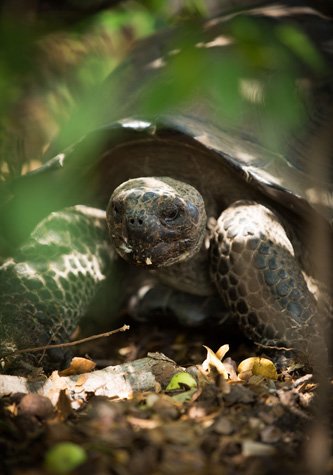 It was very sunny so we stopped for some shade in a small forest of poison apple trees. Right on the trail, we saw several land iguanas and a Galapagos hawk. As we finished our morning hike, we were lucky to see two giant tortoises hiding under the bushes trying to prevent overheating.