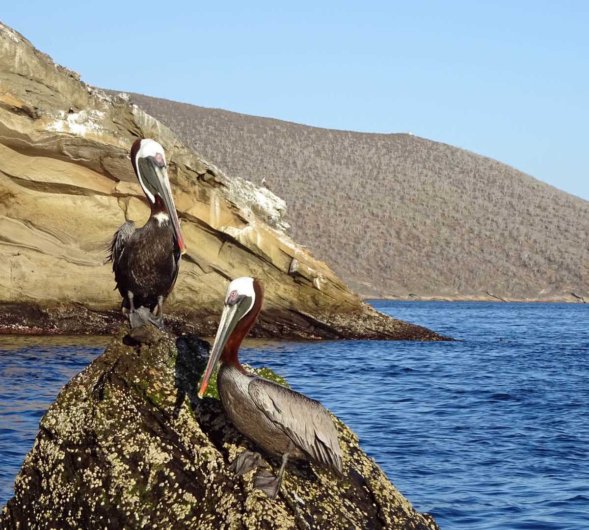 After our walk, everyone returned aboard and started to navigate towards Tagus Cove. As we dropped anchor in the calm waters of this cove, we went kayaking, and snorkeling in this place. Towards the end of the afternoon some of our guests went on an invigorating walk to the top of a crater, there the view of most of the shield volcanoes of Isabela was a big highlight. We also had a Zodiac ride along the coast of this cove; here we observed green sea turtles, Galapagos penguins, nesting brown pelicans and Galapagos marine iguanas while enjoying the last rays of sun.