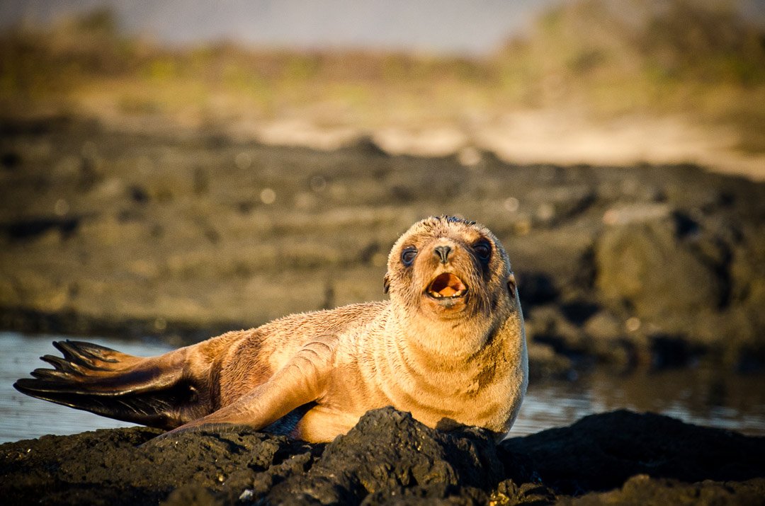 After a quiet night, we left our anchorage off Fernandina in the early morning, just before dawn. Today we visited the largest island in the archipelago – Isabela. Roxana, our wellness specialist, led a group of guests in early morning stretching on the sky deck, and what a view they had from there. Dramatic shield volcanoes and barren lava flows contrasting against the bluest of sky and sea. The day was once again cloudless and breezy; later it was actually quite hot!