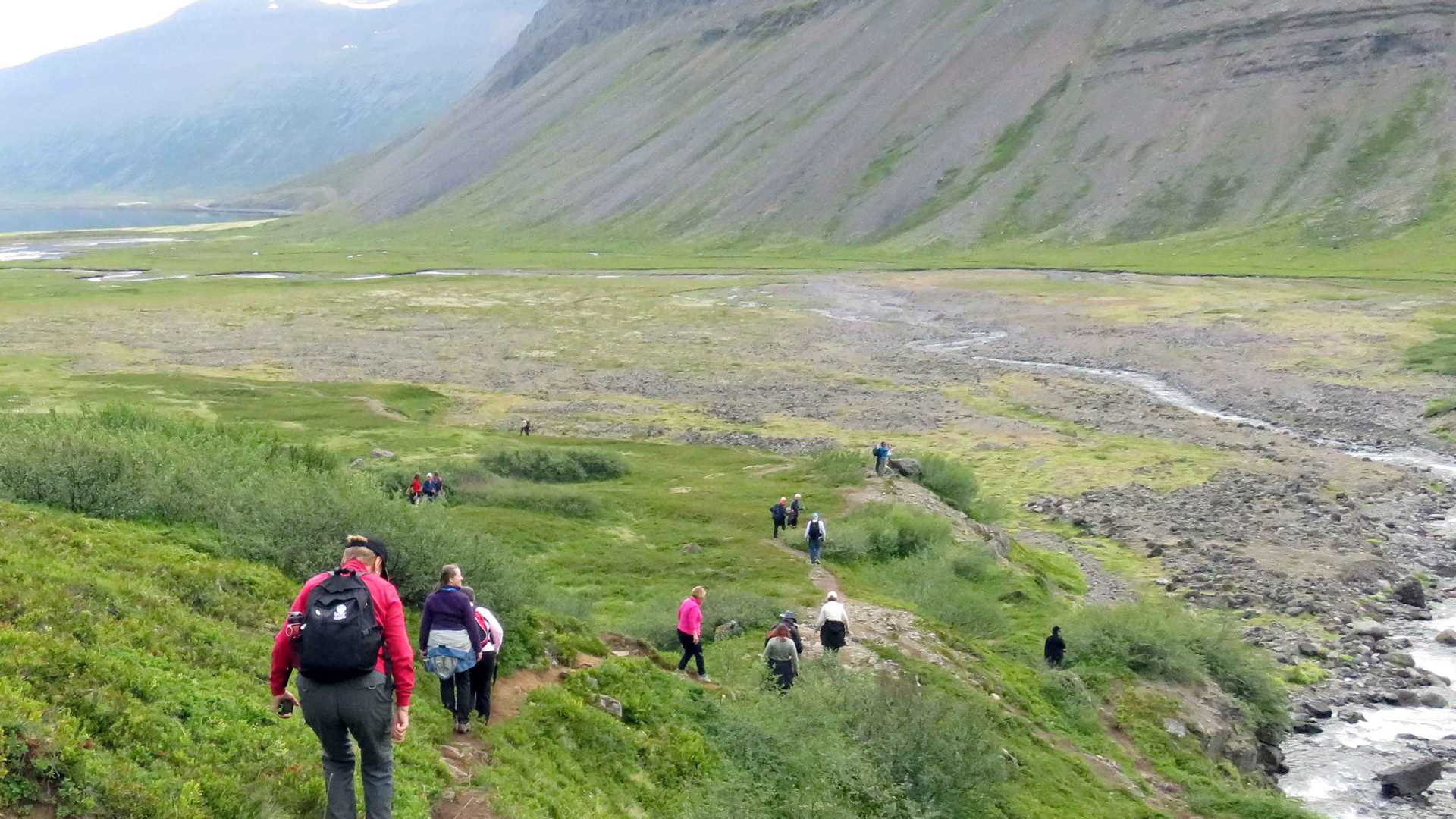 Following an exciting evening with the feisty Arctic Terns of Vigur Island, we remained anchored near this charming island overnight and then sailed for the nearby town of Ísafjörđur. Ísafjörđur is the largest town in the Westfjords and is located on a spit in Skutulsfjörđur, a small branch of Ísafjarđardjup, the largest fjord in the Westfjords. The weather was most agreeable with some clouds, a light breeze, and temperature around 11 degrees C. We were soon off on our morning excursions with the majority of us boarding motor coaches for a drive along the coast to the trailhead for the hike to Valagil.