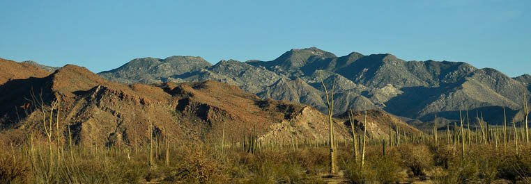 Cruising in the middle of the day continued to be upon glassy water, interrupted only by Craveri’s murrelets, Pacific loons, eared grebes, and an occasional light breeze that rippled the surface. We arrived at Bahía de los Angelés by mid-afternoon and were soon traveling up and into the mountains. Granite gave the distant hilltops a cleaner looking color than the darker volcanic surroundings. We soon passed into an area of white-barked elephant trees that gave way to tall, light-colored shafts sticking 40 to 50 feet straight up like skinny carrots. We had arrived in boojum country! These bizarre plants occur in Baja California and in the western parts of Sonora, and nowhere else in the world.