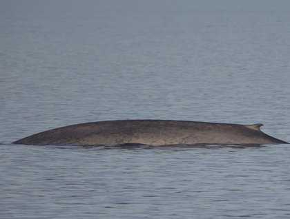 As we neared the source of the blow the naturalists confirmed—a blue whale! It’s hard to fathom its size… this creature—the largest animal ever to exist on Earth—can weigh up to 100 tons. One of our naturalists held up a picture with comparable other mammals lined up in front for scale—the elephant was dwarfed by about 8 times. Wow! We watched the whale take four or five breaths followed by a “terminal” breath with a large graceful arch of the spine revealing the tiny dorsal fin as the whale dove to feed on prey deeper down. We waited about ten minutes for it to resurface for more breaths, and the cycle repeated. After about an hour of whale waiting and watching, we dove down to the dining room for our own feeding, and resurfaced for more looks.