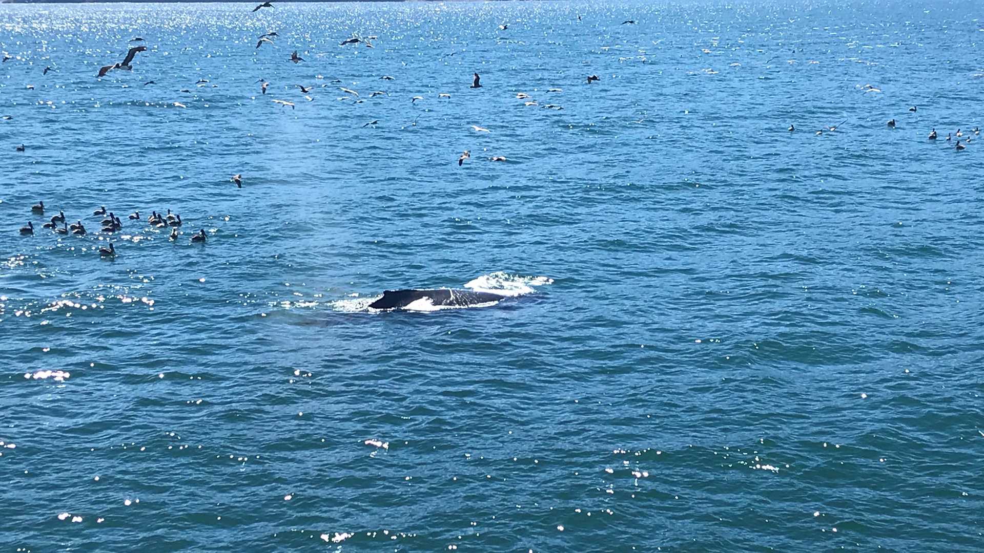 Some of us spent the morning on Zodiac tours, while others chose to fasten up for snorkeling. Sergeant majors and tan sea stars were seen beneath the surface, while a humpback whale and bottlenose dolphins were observed from above. On the way back from the beach, the snorkelers’ Zodiacs joined the tours and observed a feeding frenzy. The sky and surface of the water were speckled with brown pelicans and Hermann’s gulls, looking to catch the fish that the bottlenose dolphins missed and displaced, while the humpback whale disrupted the water with their own surfacing and feeding.