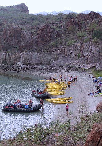 Our landing at Danzante presented many options.  We kayaked the calm waters of Honeymoon Cove, paddling about in single or double kayaks.  We immersed ourselves in the experience by donning fins, mask and snorkel and joining the denizens of the sea for a short swim.   Lastly, we did the “hike of many views.”   Danzante is a small island, but it offers sweeping views of the Sierra de la Giganta to the west, Isla del Carmen to the east, and the bowl of Honeymoon Cove to the South.