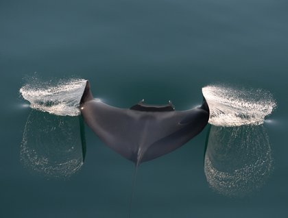 Not long after we left the humpback we passed through many Thurston’s devil rays or mobulas. These are closely related to the much larger manta rays. The water was glassy at times and it allowed us to see the creatures clearly just a few feet below the surface. The ship passed close to a ray that suddenly threw its pectoral fins up to propel itself away from the ship with a downward thrust. Today’s photo is of the water thrown into the air with the upward motion. These creatures have a white underside and a dark back to blend in with a light sky background from below or dark ocean from above. They have two feeding appendages that stick out in front of them to funnel krill and other invertebrates into their mouths.