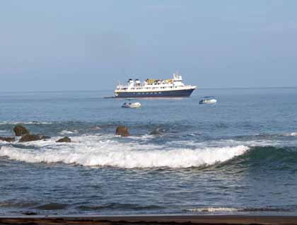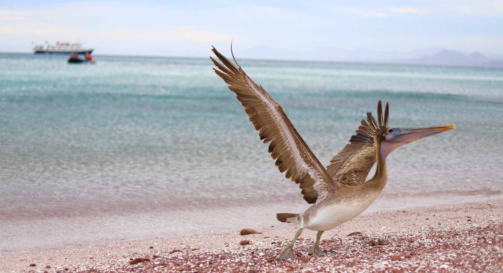 Another beautiful pink dawn received us at Isla Espiritu Santo, as we awoke in the small bay called San Gabriel, one of the many interesting small bays on the western side of this big island. Different activities were undertaken after a sumptuous breakfast. Snorkeling among the many colored small fishes, sea urchins, small corals, and different worms was intense along one of the rocky sides of the bay. Kayaking was also enjoyed, as the waters were very calm. Some of us even saw sting rays swimming speedily away from us. Fantastic animals! One group of good hikers set off across the island to the other side, at a magnificent three mile beach of white sand called Bahia Bonanza. Those of us that stayed on the ship made it to Bahia Bonanza and began our activities there, which included kayaking and hiking into the interior of the island, enjoying the vegetation with one of our naturalists. Among the cacti, a huge sour pitahaya was seen, standing alone in the desert! But the most enjoyable activity was staying on the magnificent wide beach and sunbathing, or watching the youngsters build sand castles.