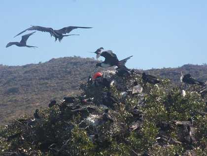 Others explored by expedition landing craft. In addition to enjoying the scenery, boaters saw the remains of a pearl farm. Pearling has long been a part of this region’s history, and this operation, though extensive, is just the most recent iteration of collecting beauty from the least-likely seeming source. Pearlers gone, the jetty they made is now the home of frigatebirds. These birds are masters of the air, huge, and yet delicate, they vie with hummingbirds for being the most completely aerial creatures ever to live. And so they are somewhat awkward on the ground. We saw them perched on seaside rocks and in mangroves clotted with guano. The birds were engaged in every sort of behavior, sleeping, preening, and squabbling. Most spectacular were a few males that had inflated their bizarre and brilliant throat sacs into scarlet balloons in hopes of enticing an available female.