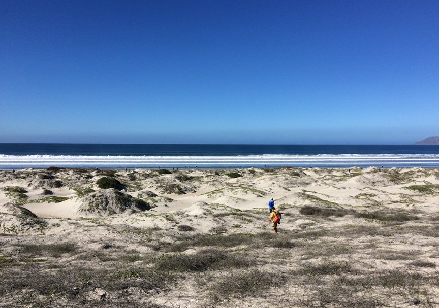 After breakfast and shipboard introductions and briefings, we boarded the inflatable boats and zipped ashore to explore Isla Magdalena.  Wow - the sand!  My feet were in sensory heaven.  First the refreshing wet landing to awaken and invigorate; then emerging from the bay to shore line, the sand was still very dense with water and my feet sank in a few inches with each step.  Ditching life jackets we made our way across the narrow island towards the Pacific side.  The sand was hard, crunchy, encrusted with dried salt, and forming interesting patterns from water and wind.  And then – wow – climbing a sand dune – soft and silky and wave-patterned.  The history of the desert is written here.  And erased.  And re-written.  A constant etch-a-sketch of life shaping and re-shaping this living moving carpet beneath our feet.  I remember being surprised when I first saw a glacier in Alaska… I could feel the aliveness and movement of the flowing glacial ice.  Here, too, in the desert, I am surprised by the life of the sand dunes, on the dunes, in the dunes.  What is this myth about deserts being barren and empty?  They are anything but.  We continued onward, wending and weaving our way around vegetation and vast shell middens, and before we knew it we had reached a pinnacle, and the Pacific Ocean spread out before us.  Oh the beauty of this place!  We made our way down and up and around, and arrived to the welcoming sight of sand dollars strewn everywhere on miles of sandy beach in either direction.