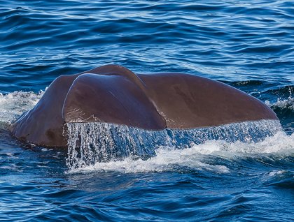 After a magnificent green flash sunrise, sharp eyes on the bow started calling out the blows on the horizon. Staff and guests in the know recognized the 45-degree angle of the whale exhalation to belong to the only species that creates such a blow: the mighty sperm whale! Soon angled blows started to be seen all around the ship, and we were amongst the largest toothed whales on the planet. Individual and pairs of sperm whales began to pop up all around us, logging while taking several breaths, only to raise their flukes into the air in order to dive into the depths.