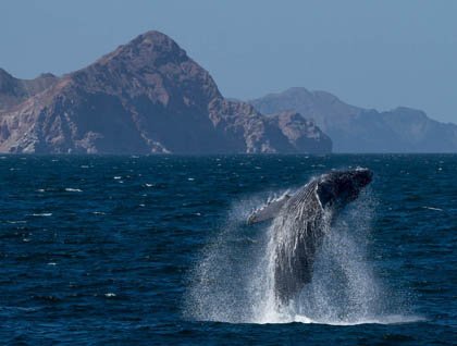 For the afternoon we were intending to head to the shores of Isla Carmen for Zodiac and kayaking options, but as we transited the rich waters of the Loreto Bay National Park, bottlenose and common dolphins were sighted, along with a humpback whale. To jump to the end of the story, we spent the next three hours in “dolphin and whale soup,” but the details are as rich as the seas. When an expedition ship encounters a group of thousands of dolphins, it is not only the wildlife, but also the experience and grace of the officers and expedition team that helped make the experience astounding. While we enjoyed a massive group of common dolphins, the bridge and naturalists kept track as we continued to close the distance between us and an active humpback whale. Flukes were raised high against the distant backdrop of the Sierra de la Gigante mountain range, the backbone of the Baja Peninsula. But then, another humpback was spotted, breaching over and over again to the east.