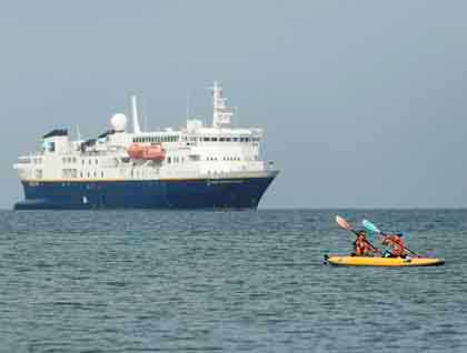 In the cool of the morning as the sun began to burn off the tropical haze, we jumped into the Zodiacs for an exploration of a pair of small islands: Bona and Estiva. These are important seabird breeding sites—a fact that was immediately obvious. Thousands of magnificent frigatebirds soared like kites in the sunrise breezes over the rocky summits of the islands, swirling, dipping, chasing and simply hanging in the air, suspended on their beautiful sharp wings, riding the winds like their nimble namesake sailing ships. At the same time more thousands of brown and blue-footed boobies poured off their roosting ledges, circled briefly and set out for their morning fishing excursions. As we approached the cliffs along the waterline of the small islands we soon had good views of these comical birds and their lovely azure feet.