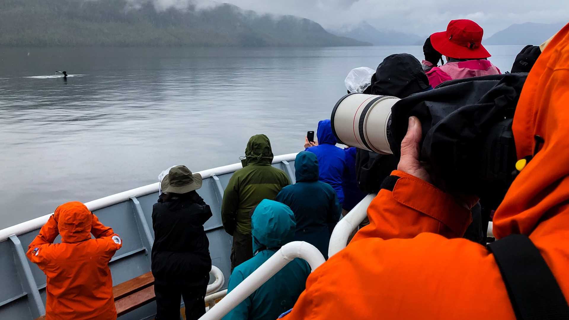This weather didn’t keep people from enjoying the morning stretch class or spending time on the bow in search for wildlife. The rain brought a calm kind of energy to the ship. We slowly, intentionally moved about the public spaces. We watched the mist dance around between the canopy of the cedar and spruce trees. We spotted the occasional pair of marble murrelets, as well as a pair of Western grebes, harlequin ducks, a variety of gulls, a few Steller sea lions, and the highlight: good views of a feeding humpback whale.