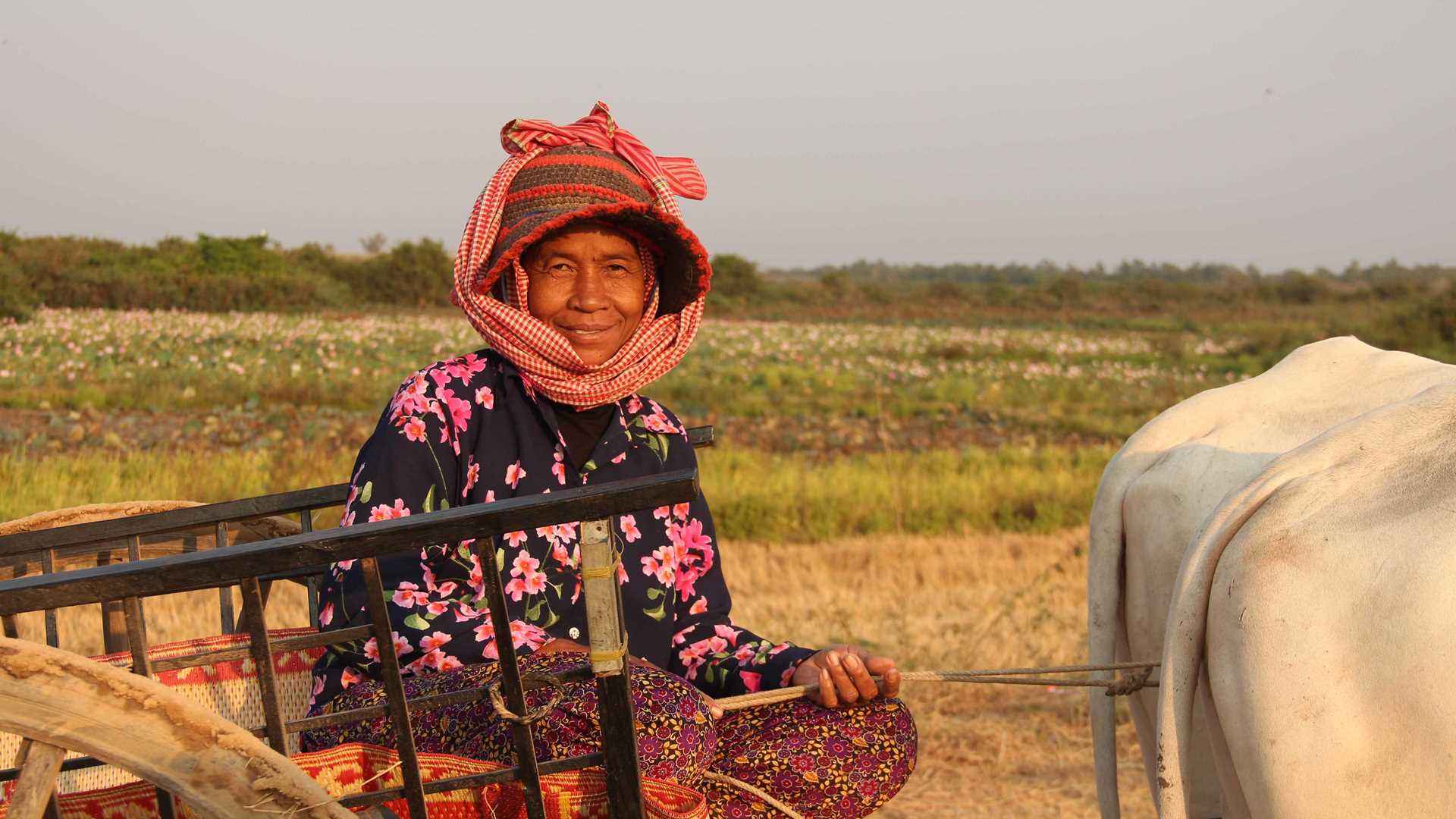Jahan was secured overnight at the riverbank, just downstream from “the port of the winter melon,” familiarly known as Kampon Tralach, which is located on the Tonle Sap river about 50km north of Phnom Penh. Since we are here in the dry season, the level of the river is low, and we have to climb up the banks to get to the local road. Awaiting us in this small village is a column of oxcarts, each pulled by two brahman cows under the direction of a local farmer. These carts are used on a daily basis throughout most parts of the country, and the cattle are not bred for meat but instead for labor. This is why they are typically so thin, as they are not being fattened for slaughter. We take a ride through the rice fields and end up at the local public school. The Kampong Tralach School has been supported by Lindblad/National Geographic for several years now, providing funding for free English learning programs.