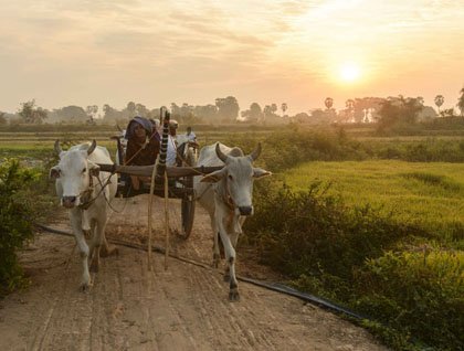 Today was simply magical! We woke up before dawn and disembarked from the ship as the sky was turning pink and orange with sunrise light. A whole line of ox carts drawn by white brahman cattle greeted us on a dusty dirt road. We crawled into the carts as the sun rose among the palm trees and we rolled out into the rice fields. Bumping along the small road we passed field after field of brilliant green rice dotted with picturesque trees and motorbikes. Periodically we heard the thrumming of pumps bringing water into the fields. We had a brief stop at a lotus field where we wandered among beautiful pink blossoms and learned about lotus cultivation and uses.