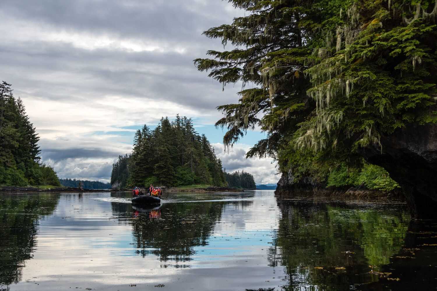 The Keku archipelago is full of life, and we found all manner of excitement during our morning exploring these islands in our expedition Zodiacs. Marbled murrelets, belted kingfishers, pigeon guillemots, and bald eagles flew nearby as we poked our noses into all the nooks and crannies of the islands covered in forest and flowers. Jellies and pteropods floated through the kelp forest while sea otters and harbor seals bobbed around nearby, but the humpback whales gorging themselves on bait balls just offshore truly stole the show. It was truly a case of not knowing where to look, but not really caring because there was something magical to see in every direction! After lunch, some of our more daring guests went for a dip in the chilly waters before we started heading out to Frederick Sound where we may have had the highlight of the day: we found some northern resident killer whales from the R5 matriline! We watched this family group for a while before going our separate ways in the peaceful, flat, calm waters.