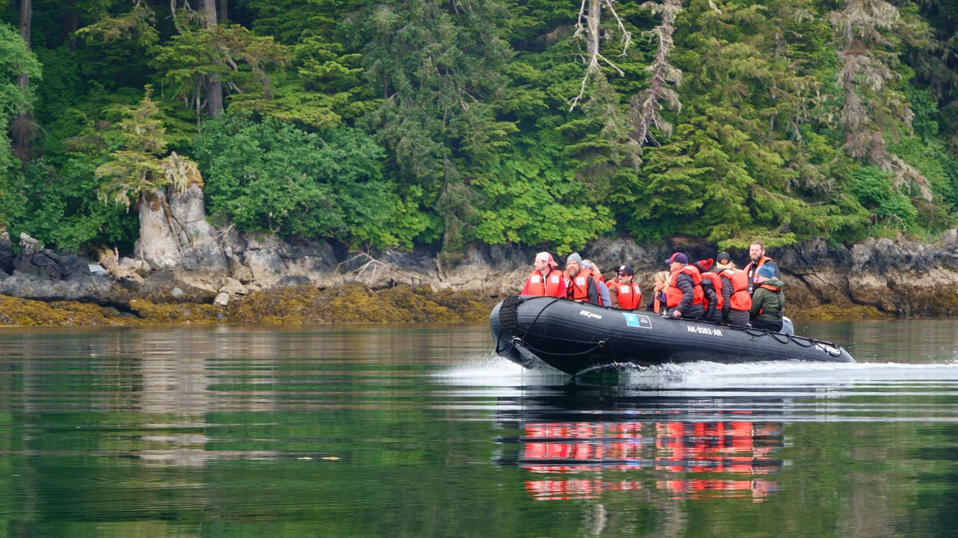 We began our day with National Geographic Quest anchored in the glass-calm waters of Keku Islands. A meshwork of islands comprised of mostly limestone and some granite, each one is carpeted with stunning hemlock and spruce forest. We explored these islands and the waters around them by Zodiac this morning, taking time to examine the smaller nooks and crannies while looking for the abundant wildlife found here. Before breakfast, we had the opportunity to watch a couple humpback whales foraging along the shoreline just off the bow of the ship.  Harbor seals were hauled out on the recently exposed rocky reefs as the tide dropped with each passing minute. Bald eagles perched atop the trees drew our attention repeatedly, and as a grand finale, a single humpback whale fed in the more open waters, providing an impressive show for us to enjoy from the comfort of our Zodiacs. It’s always a thrill to observe these massive, 40-ton creatures from the perspective of the water.