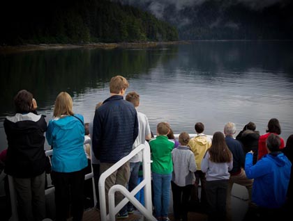 Southeast Alaska welcomed us this morning with her typical finicky behavior—rain turned into heavy fog which turned into low-hanging clouds which turned into mostly cloudy skies with brilliant patches of sunshine. As we cruised through Kelp Bay we were greeted by the sight of a humpback whale cow and calf. The water was flat and the winds were calm so their misty blows hovered in the air for seconds before disappearing. Their hypnotic movements were a calming way to start our day. A brief bear sighting in the late morning delayed our introduction to digital photography presentation, but our photo instructor, Sharon Grainger, managed to squeeze it in before lunch.