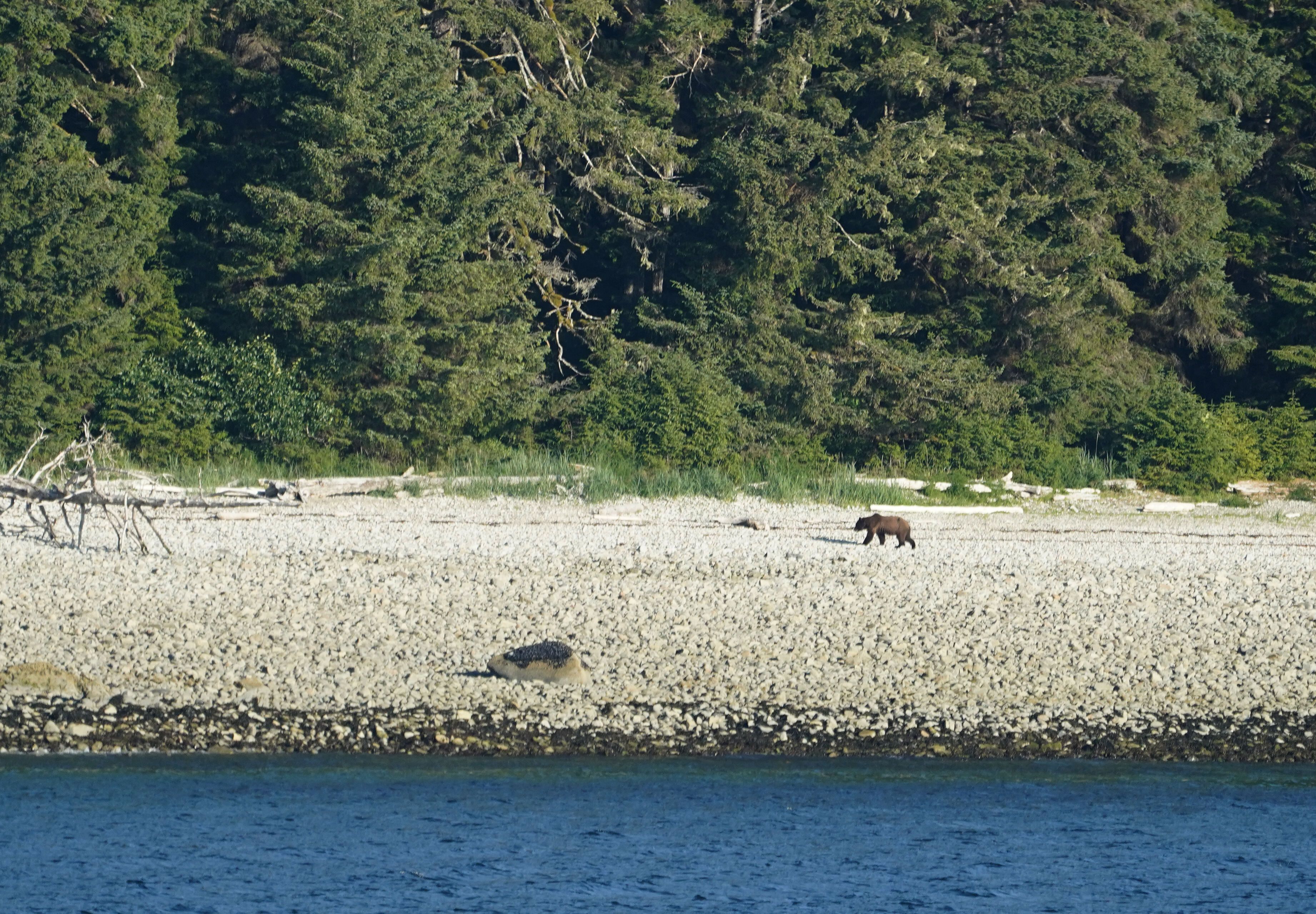 Another day of Alaskan sunshine greeted us as we started our last full day of adventure aboard National Geographic Sea Bird. We set anchor in Kelp Bay on Baranof Island in the Tongass National Forest. With calm waters and clear skies, the conditions were perfect for spotting wildlife. Just after breakfast, we spotted the wispy blows of humpback whales in the distance. We began the day’s activities with expedition landing craft rides, and we caught up with a humpback whale and explored the intertidal zone. After lunch, National Geographic Sea Bird transited farther into one of the south arms of Kelp Bay, and we set out for an afternoon of kayaking in the shimmering waters and hiking and bushwhacking in the surrounding wilderness. We were fortunate enough to encounter a coastal brown bear, and we watched as he dug in the dirt, rubbed his back on a tree, and eventually lumbered away into the forest. We finished the day with a commemorative slideshow of all our experiences throughout the week in the company of newfound friends. We felt a sense of gratitude for the beautiful places we have had the joy to explore.