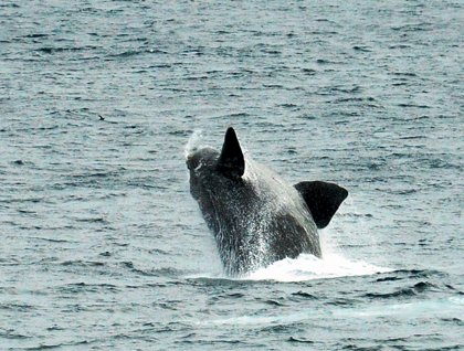 After lunch our last view of South Georgia would be memorable as the captain took the ship into the Willis Islands for a close up look at the huge macaroni penguin colonies. While on approach a beautiful sculpted iceberg was grounded and worth a thousand photos taken as we slid past. Just as the ship was about to leave a Southern right whale was spotted. These slow moving behemoths were preferable hunted to their speed, flotation when dead, and large amount of oil. It is only in recent years that their numbers have begun to increase. We saw feeding and logging, but the best of all behaviors was breeching from one of the more than 30 right whales we ended up seeing as we departed from South Georgia after six days of wonderful experiences.