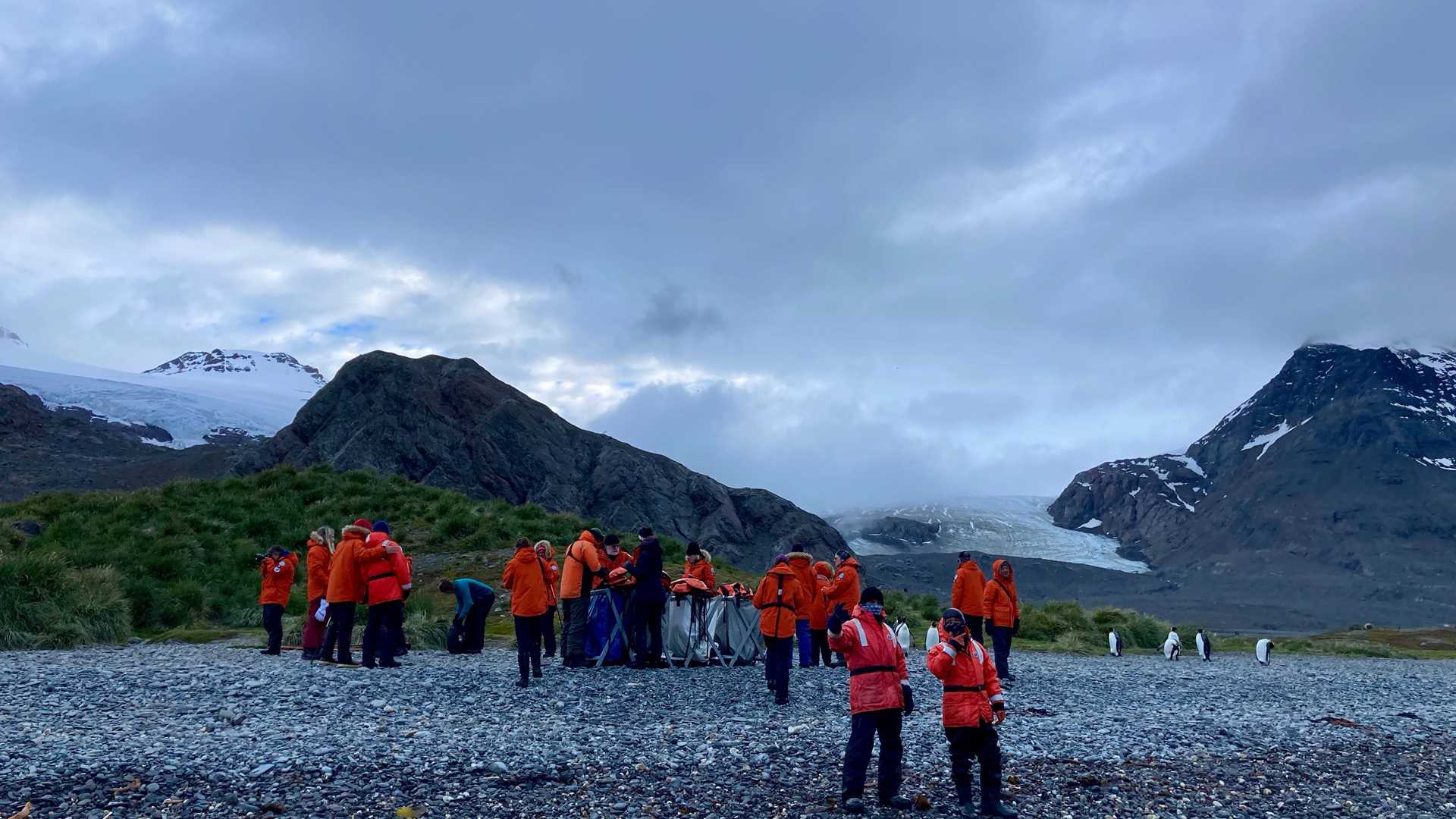 Today we are anchored in King Haakon Bay. Where is that? I would say, “It is on the southwest side of South Georgia.” However, since South Georgia is shaped like a comma, King Haakon Bay is north of most of the island. Anyway, it is a beautiful morning: cloudy, moody, and not really cold.  We are deep into the bay at a site named Peggotty Bluff (or Camp), named for the Peggotty family who lived in an overturned boat … as written in David Copperfield.