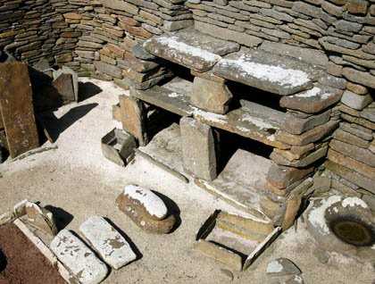 These islands have been occupied since the end of the Ice Age some 11,000 years ago. Initially nomadic bands of hunter-gatherers lived off the seasonal bounties of nature. This was all to change with the arrival of early agriculturalists in the fourth millennium B.C. Settled communities were established, crops planted, and domestic animals bred. A village belonging to these people was discovered in 1850 at Skara Brae when the top of a sanddune was shorn off during a storm. A number of exceptionally well preserved stone-built houses had lain for millennia encased in sand. During the morning we visited this site. The monument has been sensitively developed as a visitor attraction. One can gaze down into the actual interiors of these ancient structures. Archaeological excavation of the remains indicates that this neolithic village was occupied continuously over a period of 600 years before being abandoned at the beginning of the Bronze Age sometime around 2,500 B.C. Everything was fashioned in stone—the house walls, the beds, the dressers, the hearths.