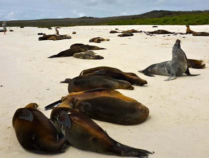 With the perfect weather conditions we took advantage of the situation and offered hiking ashore, kayaking in the protected bays and Zodiac cruises along the rugged coastline. One distinctive feature of this site is the towering cliffs covered in breeding Bunnich’s guillemots and kittiwakes as well as the carpet of lush moss and flowering plants benefiting from the abundant nutrients raining down from the cliffs above.