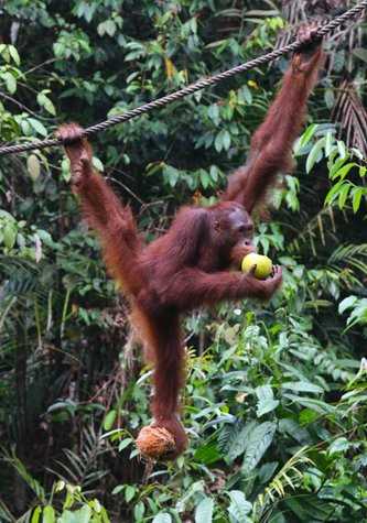 While they are indeed independent creatures, the park rangers regularly place bananas, mangoes and coconuts at feeding stations to supplement their diet as their habitat, while large, is considerably more limited than it would be in the absence of humans. Even with this free lunch so easily obtained, the red people of the forest are not dependent on it at all. In fact, frequently no one shows up to claim the sugary offerings. Today however we are lucky, upon a not insubstantial amount of patient waiting, rustling and movement of leaves can be seen growing closer. Glimpses of the russet hair-covered limbs swiftly moving along branches can be seen through the dark shadows of the green canopy. Finally an adolescent male is fully visible, he lowers himself onto the platform and seemingly ignores his delighted but silent audience and gathers a few pieces of fruit, preferring to eat them suspended. Content with his snack he starts to leave but pauses and looks back at us momentarily, regarding our presence with what could only be called mild curiosity. Then, rightfully dismissive of us, he plunges back into the foliage to continue on with his life as a wild and free animal.