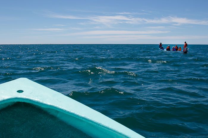 A better way to get to know Baja California was never thought of before. We anchored this morning off of San Ignacio Lagoon. One of the legendary breeding and calving ground for the California gray whale. The weather, wind, and whales were more then cooperative today. Three rounds of tours went out to view these magnificent creatures at close range. Better whale watching can not be had anywhere else. The animals are usually no more then 50 feet from our small local-operated Panga boats. Occasionally the young calf whales will swim right up to the boats and more then once we observed a mother whale actually lifting her young up to the boats, as eager human hands reached out to splash and actually young a wild whale! One this day, lives were changed.