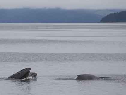 Our day started very early today in a spectacular way. Long before breakfast, we encountered several humpback whales congregated over a large area, very active at the surface. We were able to see whales in all directions, far and close. But the ones that got most of our attention were a female and her calf. The young one, presumably born just a few months ago in the warm and clear waters of the Hawaiian Islands, was very active swimming all around the place and surfacing all excited many times. He even rolled on his side a few times showing his long pectoral fin! His mom was also pretty active, but she was all business: after a long migration of several months to the tropics to give birth to her calf, during which she fasted, now she is hungry. Back in the cold productive waters of Southeast Alaska, she wastes no time in getting back into shape and this morning she regaled us many times with great views of her huge mouth as she fed at the surface. Every few minutes she broke the calm waters with her mouth wide open, showing the baleen inside, to engulf several tons of seawater together with prey—possibly herring. We watched her in awe for a long time and eventually headed towards our morning destination at Lake Eva.