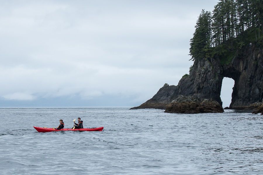 Calm water in Hanus Bay greeted us, and the National Geographic Sea Bird sailed towards our anchorage for morning operations. After breakfast, we headed to shore to enjoy hikes along a salmon-spawning stream and through sections of towering old-growth forest towards Lake Eva. Many guests took advantage of kayaks and paddled in the quiet bay, or toward a small pond upstream of a small waterfall. The salmon had arrived, though not yet in the numbers expected later in the season. A small gillnet fishing boat was plying the water near our anchorage. The passengers aboard shared that they had caught more than 30 sockeye salmon that morning. With fish in the stream, the bears will not be far behind, and a few lucky guests caught sight of a juvenile brown bear near the stream during the second round of kayaking.