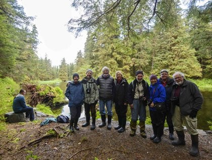 The day began with a humpback whale and chilly overcast morning, which in typical fashion for this trip lifted into blue skies. The whale circled in front of the bow, feeding and diving as we slowly made our way towards our anchorage. After breakfast we zipped to shore. Some folks paddled out in kayaks, exploring the mouth of a stream and admiring the pink-purple-gold shooting stars along the shoreline. Goldeneyes and blue-winged teals floated alongside the kayaks, and hikers enjoyed photo ops of the colorful kayaks. The long distance hikers hit the trail to trek out to the banks of Lake Eva and stand among giant old growth sitka spruce. Other walks wandered the trail admiring and photographing spring flowers, lichens and moss, squirrel middens, sapsuckers and slugs. Bear scat speckled the trail and we had a taste of real brown bear country.