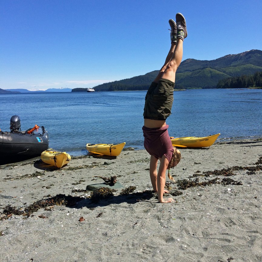 We awakened this morning to clear blue skies and sunshine. Yet, as the National Geographic Sea Lion continued along Chatham Strait we moved through several frigid fog banks. I came out to the aft 100 deck for light exercise class to people sheltering from the chill in the corner. We dispersed to cabins for another outer layer and re-emerged back on deck to do some shaking and stretching. After breakfast we anchored on the east side of Chichagof Island to take walks and explore the waters in kayaks. Walkers took to the trail winding through beautiful forest along a sockeye salmon stream. Mmmm… the air is so fresh and fragrant here! Long aerobic hikers made it up to some old-growth Sitka spruce trees at Lake Eva, and continued on past the end of the newly-graveled trail, through mud, roots and felled trees. We encountered some signs of bear along the way – scratches and fur rubbed off on the end posts of a new creek-crossing bridge, as well as several piles of scat on the trail, and digging around some skunk cabbage and devil’s club roots. We also saw deer tracks and heard songs of many birds. We were scolded by red-tailed squirrels and walked past their spruce cone middens. At the midpoint of our walk we took a 5-minute quiet break to experience the forest sounds and sensations.