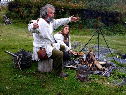 The remains of the buildings consist of a series of low grassy mounds and ridges clustered on a low ridge close to the shore. Following a viewing of a short video in the visitor centre, which detailed the background to the discovery and subsequent excavation of the remains, we made our way down to the site itself. Here a series of low grassy banks and mounds are all that indicate the once substantial sod-walled homes and workshops of these stout-hearted entrepreneurs. A longhouse has been reconstructed and animators, attired in typical Viking clothing and equipment, explained the lifestyle of the erstwhile inhabitants.