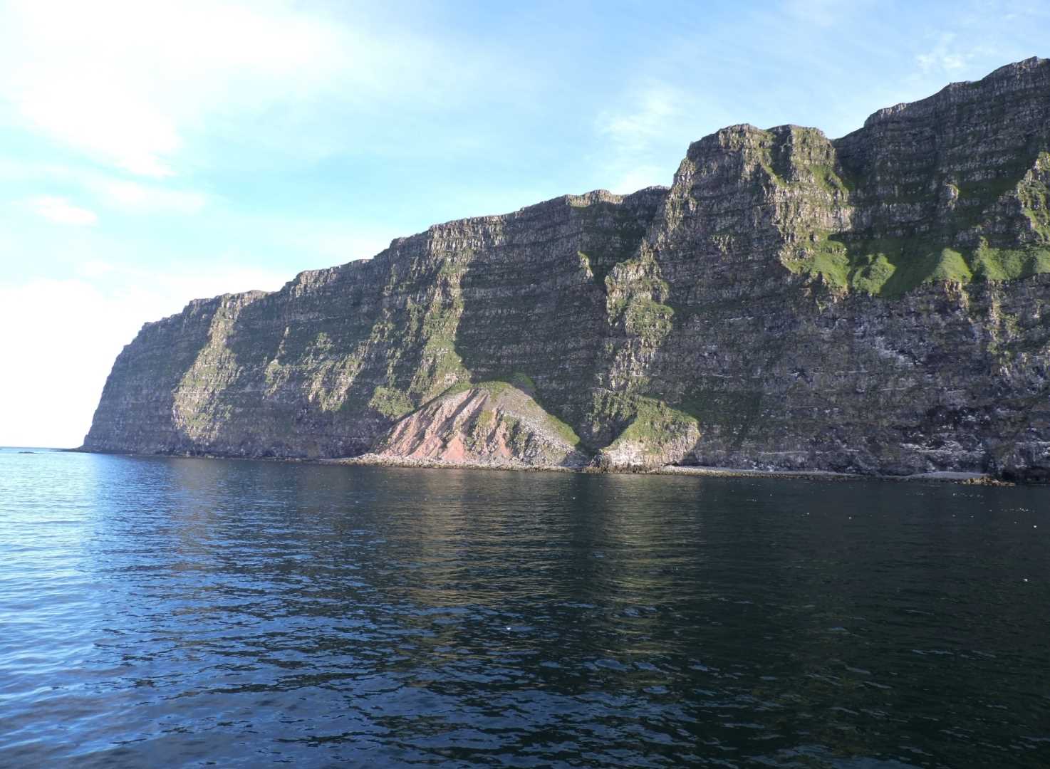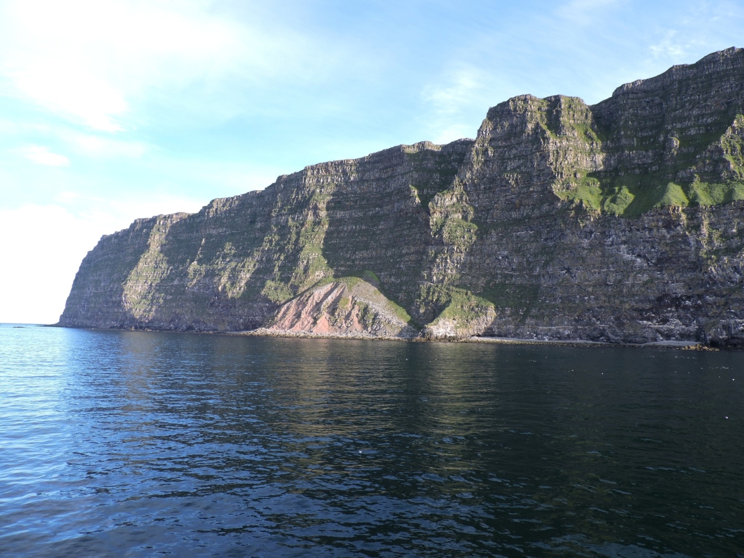 We awoke early this morning just off the spectacular Latrabjarg Cliff of Iceland’s rugged northwestern region. These volcanic cliffs are composed of ancient layered tertiary basaltic outflows that provide perfect housing to millions of nesting seabirds. This site includes approximately 40% of the world population of razorbills, as well as countless thousands of guillemots (common murres to North Americans) and other members of the auk family…Atlantic puffins and black guillimots. In addition, we saw many breeding northern fulmars and kittiwakes in the waters around the cliffs. Latrabjarg, Europe's largest bird cliff, measures about 14 km (9 mi) in length and rises to 440 m (1,450 ft) in height. For centuries, brave men were roped down on the cliff face during the breeding season to collect both nesting birds and their eggs for food. Sometimes as many as 40,000 eggs and 36,000 birds were taken.