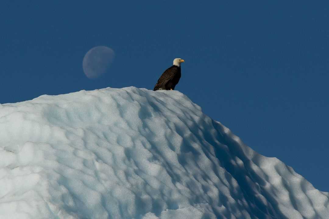 It was a rare day! This is Southeast Alaska and it rains, a lot. It’s a temperate rainforest. There’s a reason why the forests are so green! There’s plenty of daylight and plenty of moisture. Locals laugh about putting seeds in the ground and jumping back to get out of the way. We grow some pretty incredible gardens here. This part of the Inside Passage (also known as the Alexander Archipelago) gets a whopping 130 inches of rain a year. And on summer solstice (just a couple of weeks ago) we got 18 hours and 18 minutes of daylight. Notice that we aren’t talking about sunshine, but rather hours of light. A full day of bright, hot sunshine is so rare that locals call it “severe clear.” We have to dig in the medicine cabinet to find the sunscreen. But today, we awoke to a bluebird day that was stunning: not a cloud in the sky, not a ripple on the water. At 7:00 am our Zodiac excursions began, and right off the bat we found something rare – a huge iceberg with a full grown adult bald eagle perched on the top, and nearby was a lovely view of the moon. And with a little careful “cruising for composition” our trusty Zodiac drivers put us in the right spot for the perfect image. It was an outstanding morning of slaloming around cerulean blue bergs using some of our newly acquired photographic skills! And then it was time for Petersburg.
