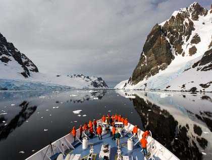 As we had lunch back onboard the ship slowly relocated in towards Pleneau Island. But even lunch was not sacred, and the call to come out on deck and see the absolutely spectacular scenery with mirror calm conditions was made. Wow, Antarctica at its best! With a plan for the afternoons activities hatched, we boarded the zodiacs for a cruise through icebergs and sea ice, looking for wildlife and sculptures of icy proportions. But even best laid plans go out the window when something unexpected happens…and all of a sudden an emperor was found. The zodiacs sped towards the location, and everyone got to see the large figure of a juvenile emperor penguin way up on a snowbank, molting and looking a little worse for wear, but still the largest and most fabled of the penguins. Some chose to step ashore, and with the bird in the spotting scope, we were able to see the finer details of this truly Antarctic beast.
