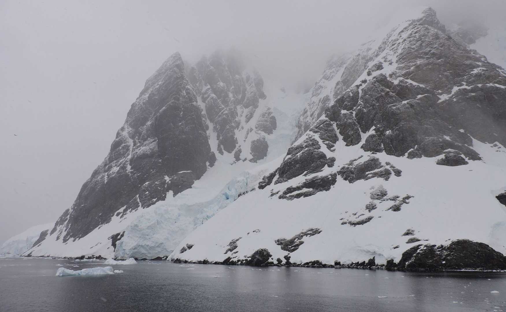 Early this morning, we entered the north entrance to the Lemaire Channel. It was named by Adrian de Gerlache in 1898 in honor of the famous Belgian explorer Charles Lemaire who worked in the Congo. Some would say, including many of the staff members, that this is the most beautiful stretch of water in the Antarctic Peninsula. Located between the peninsular mainland and Booth Island, the channel measures about seven miles in length by about one mile wide. It was formed by a geological fault that has been scraped out by glacial action, and the steep mountains on either side (igneous and metamorphic rocks to port and intrusive igneous rocks to starboard) presented wonderful displays of both geology and glaciology. It was moderately choked with ice, including some nice icebergs, and the low cloud cover and light snow made it even a bit eerie.