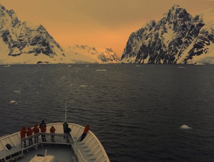 By 0600 our keen corsairs were already manning the decks at the promise of scenic booty. We threaded the icy defile of the Lemaire Channel, black water 1000’ deep and on either side sheer mountains soaring 3,000 feet straight up to icy peaks. Once round the back of these crags we found a sheltered anchorage in Port Charcot, named after the charismatic French explorer Jean-Baptiste Charcot who headed two courageous overwintering expeditions here in 1903 and 1907. Disappointed to find that our landing site was blockaded by impervious glacial ice, we took to the Zodiacs instead to explore the bay.