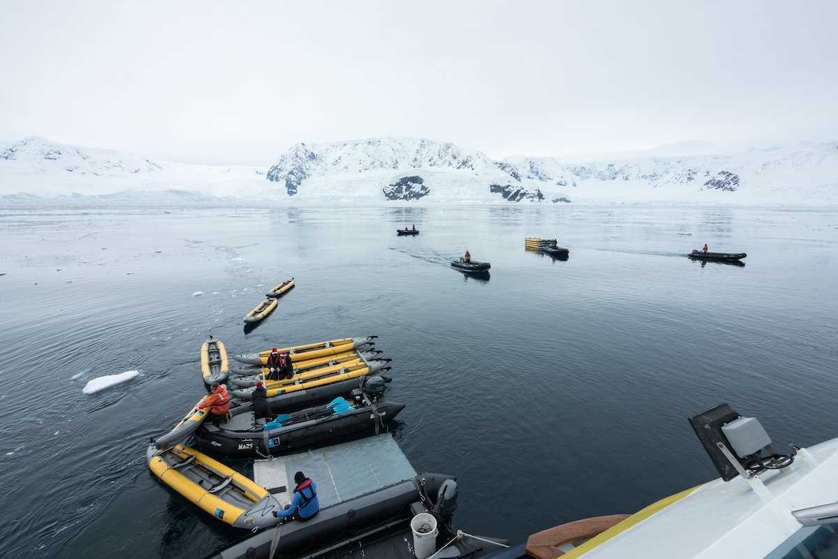 Working together, the staff and crew teams set up our kayak platform off the marina deck at National Geographic Orion’s stern, ready to launch everyone out to explore the beautiful surroundings. Others set out to explore by Zodiac. Gentoo penguins porpoised through the ice floes, and a surprise visit from a playful minke whale quickly made for an exciting morning on the water.