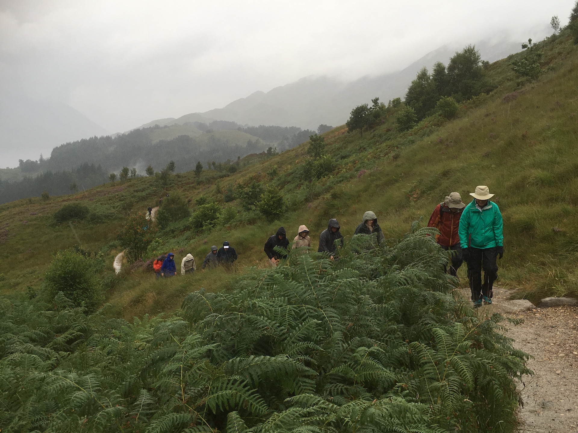 We also had the option of a gentle nature hike with David and Stewart. Or for those that wanted some more exercise Brian (the hotel manager) and Konia offered a hike from the train station past the famous Glenfinnan viaduct (which was built in 1901 and is now famous because of the Harry Potter movies) to the Visitor Centre. Despite the first rain on our trip (!), we all enjoyed the scenery with the heather in full bloom–really bonnie! And yes–we had a lovely time, but we had to look at our feet as we walked–see picture!