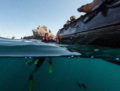 After tucking the National Geographic Sea Bird into the protection of the tiny islet of Los Islotes, we began our morning operations right away to take advantage of the conditions. Barking in the golden morning light, we could see and hear California sea lions very nearby. Our enthusiasm at a peak, we donned our gear for a face-to-face encounter with the Gulf’s most entertaining resident. Much like the children on board, the gangs of young sea lions patrol Los Islotes’ protected shore looking for something to do, often rough housing and playing tag. Kids watching kids. Hoots and hollers reverberated through snorkels as sea lions made looping flybys and tugged on colorful flippers. Smiles and bewilderment accompanied all on the short ride back to the vessel, recounting our favorite sea lion experience replete with gesticulation and interpretive dance. These sea lions provided us with an unforgettable experience that will hopefully change how our guests see the underwater world and all that live within it.