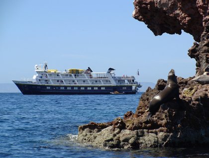Today an early wakeup call by the expedition leader announced that a pod of long-beaked common dolphins were diving around National Geographic Sea Bird. It was interesting to see a couple hundred of these magnificent marine mammals concentrated on feeding, as we derived by their behavior. Simultaneously, our naturalists found a blow from a 45-foot-long Bryde’s whale, also called tropical whale, showing an erratic, unpredictable pattern of movement. After a time with these marine mammals, the ship moved to our morning destination, a place called Los Islotes. A group of little volcanic islets compose Los Islotes, which holds a breeding (not at this time) colony of California sea lion, the only resident pinniped in the Gulf of California. In this locality our guests and staff snorkeled amongst the baby sea lions, born in the last mating season, but once or twice there were also big males (beach masters) diving around us. After the snorkeling, we all took cruises on the expedition landing craft around the place to get another perspective of the animals. Frigatebirds, blue-footed boobies, brown pelicans, turkey vultures, and a peregrine falcon were observed above Los Islotes as well.