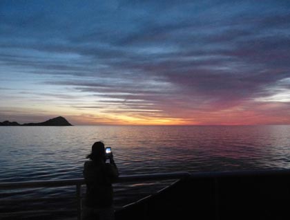 Morning aboard National Geographic Sea Bird. For the very early risers it meant stepping onto the foredeck in full darkness with our ship still at anchor in Half Moon Bay, Isla San Francisco. Our reward was a brilliant display of stars, the Big Dipper pointing the way to the north, the scabbard of Orion hanging from his belt, and Jupiter shining brightly in the west. The stars faded as a thin veil of clouds covered the sky and turned the eastern sky into a spectacular light show. The old adage "Red sky in the morning ..." turned out to be false, as our red morning sky led to another beautiful Baja California day.