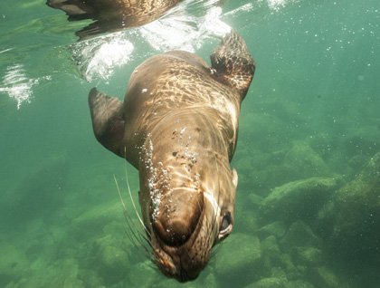 The National Geographic Sea Bird began bustling with activity at first light: feet climbed ladder rungs to the Lido deck and the crane hummed its melody as Zodiacs swung over the side and descended to the water. People climbed aboard and glided towards Los Islotes, the islets, for sunrise experience of these beautiful geologic formations of compacted volcanic ash, and home to California sea lions, blue-footed and brown boobies, magnificent frigatebirds, brown pelicans, turkey vultures, and Sally Lightfoot crabs. The sun painted the sky and surrounding landscape a dazzling dusty pink, purple, and blue, the air was a balmy 80°F degrees, the water calm and clear, and the “Ark, Ark, Ark” of the sea lions punctuated the scene. The zip, twirl, zoom of the sea lions’ graceful playful antics enticed people to don snorkels, masks and fins for a closer look.