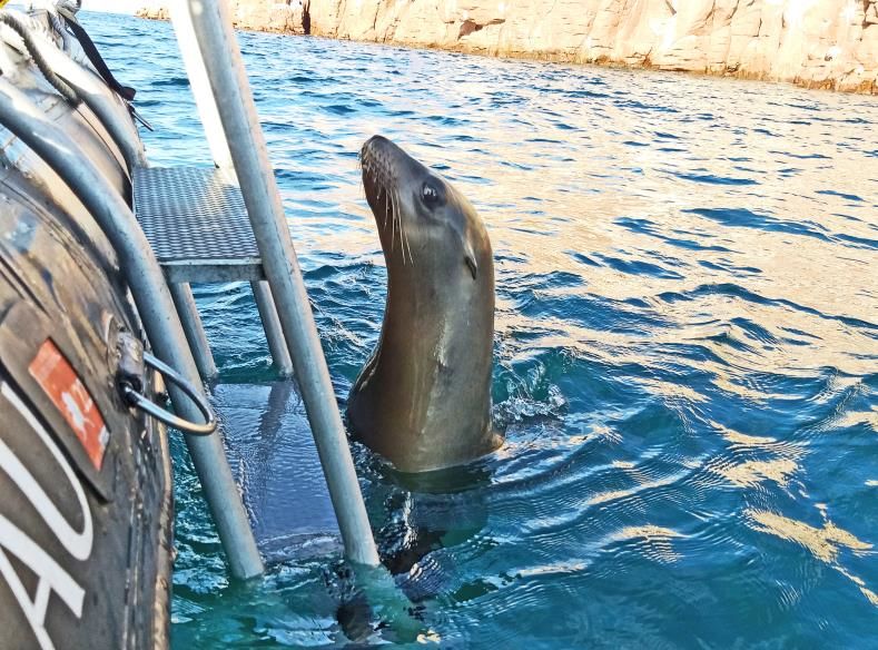 Once the ship anchored, the expedition landing craft took our guests and naturalists for some refreshing snorkeling among the sea lions. Dozens of pups swam and dove around us. Some of the now eight-month-old pups just floated in front of our masks and snorkels, doing their funny playing, whereas others tried to touch our fins, cameras, and even our hands, with their noses and whiskers. They played a lot, chasing each other in fast races in and above the water. One even tried to get on a boat! It was just a fantastic experience, as the photos can testify.