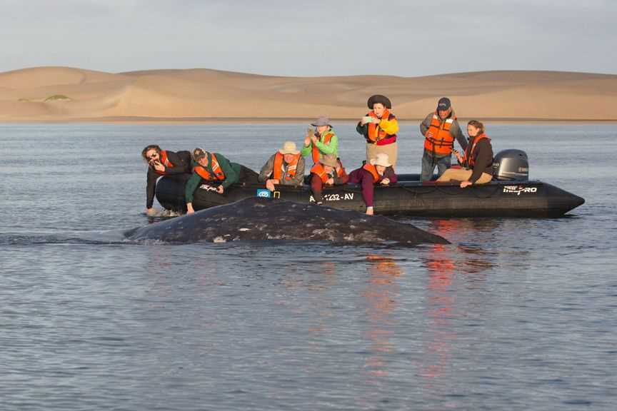 It wasn’t all about whales, however. Before or after the whale watches, we went ashore to the beautiful and pristine dunes for leisure time: walking, sitting, and boogie-boarding (on sand!). We returned to a wonderful brunch and as we sailed south to Sand Dollar Beach, we were escorted by five bottle-nosed dolphins who briefly rode National Geographic Sea Lion’s bow. After the leisurely sail, we landed on a sheltered beach, and then walked 1.5 miles across to Sand Dollar Beach on the exposed Pacific. The serene experience on two different beaches was a perfect way to end the magical day. Before dinner, we viewed the collection of our photos that were submitted for the traditional guest slide show and relived memories from the trip and spent a final evening with new friends. To paraphrase a famous movie quote: “We’ll be back!”